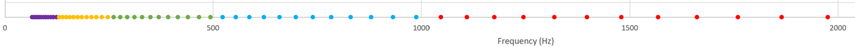 Note that the relationship between adjacent notes is exponential rather than linear - i.e. the notes are not evenly spaced, but grow in distance for each higher note.