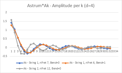 The same note can be played on different strings, and via bending from a lower fret on same string. Each of these ways produce the same fundamental frequency, but alters both the harmonic frequencies and their amplitudes. This is shown on the following two figures.