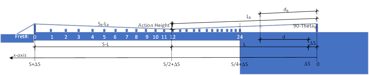 The previous sections described the general framework for the model of the sound recorded by a pickup, but did not show all the details, particularly how the scale compensation and bend amount impact all of the parameters. This section derives the equations more completely. The following diagram illustrates the geometry and variable symbols used in this section.
