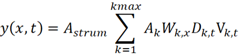 Using the definitions for the primary variables in the table for dy(x,t)/dt, the string vibration at a given x is modeled as: